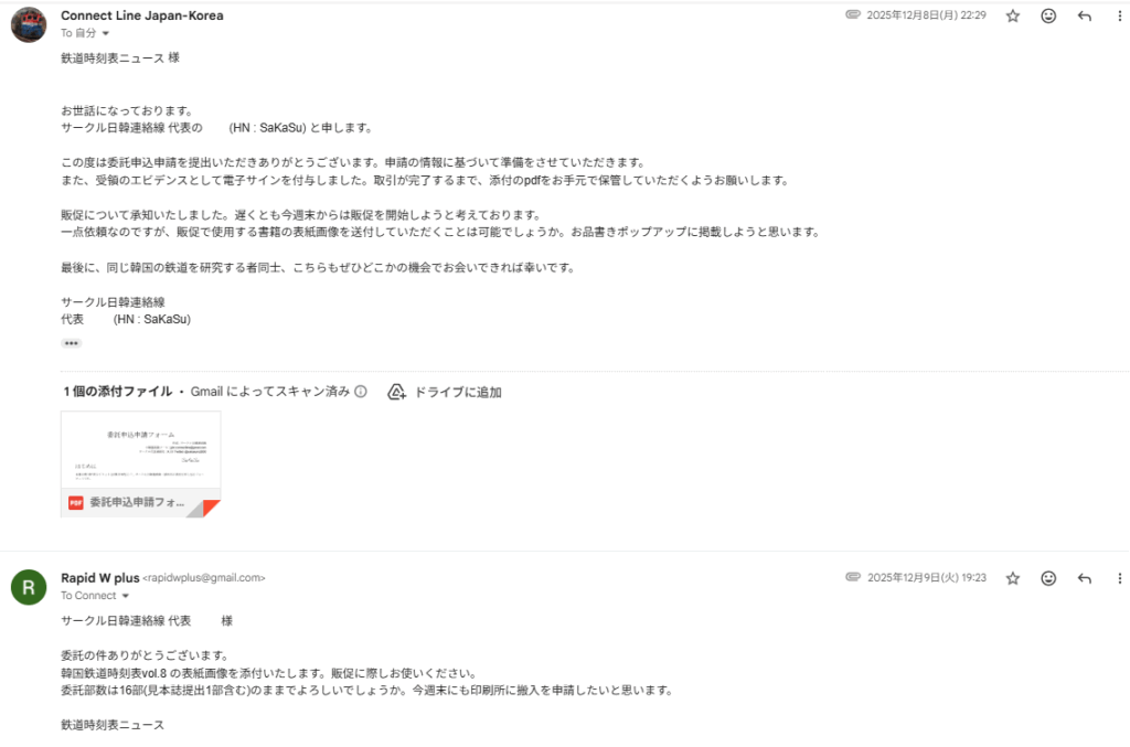 がいざ当選速報を見ると(めずらしく)どうやら韓国の鉄道をサークルが3つありました(ちなみに夏コミは韓国の鉄道扱っているのうちサークル1つしかなかったぞ。夏なにやってんだおい)、その中でコミックマーケットに参加歴のありちゃんと印刷所ともやりとりができ適正価格で頒布できるであろうサークルに委託をお願いすることとしました。