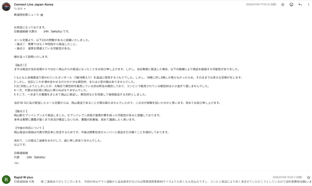 まあそれでも依頼主住所と発送箇所が近ければ次回も(多少委託率は下げるにしても)委託料25%以上で今後も委託していただこうかなとも思っていましたが、言い訳のウソがすぐばれそれをまたウソで塗り固めるほど哀れで滑稽な姿を見てしまっては今後これ以上のトラブルになることが容易に想像できますしこちらも信用ができません。私の介助も反故に終わるだけでした。2026年1月のインテックス大阪開催のこみっくトレジャー47にてうちのサークルに今度は配本することも考えていましたが、梱包後の発送がまともにできなず金銭に関して言い訳で塗り固める以上金銭信用が著しく低く危険と判断せざるを得ないでしょう。金輪際この人に委託は不可能ですし、この人からの委託も不可能です。