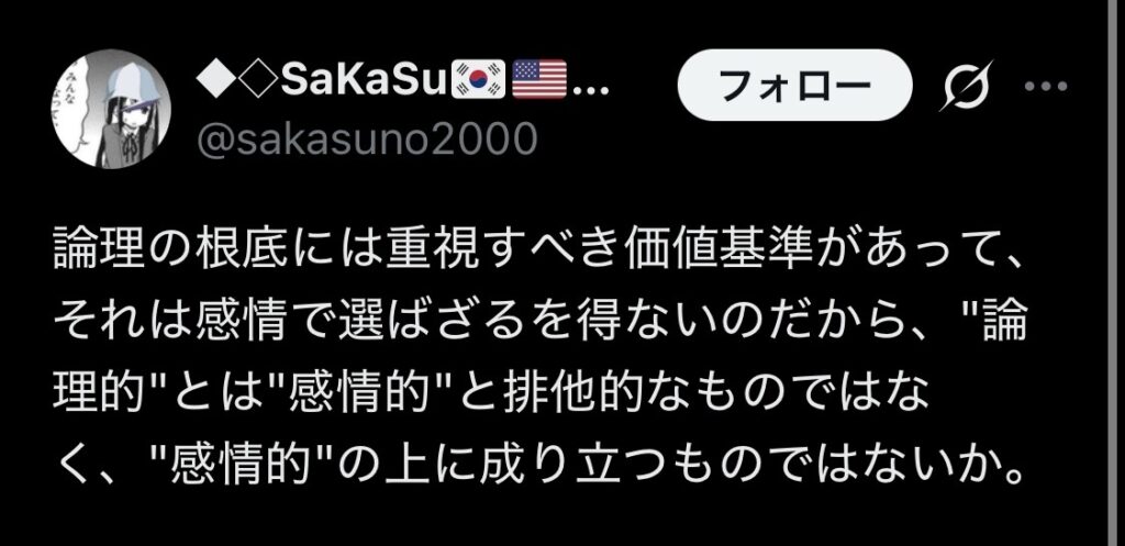 論理の根底には重視すべき価値基準があって、それは感情で選ばざるを得ないのだから、"論理的"とは"感情的"と排他的なものではなく、"感情的"の上に成り立つものではないか。